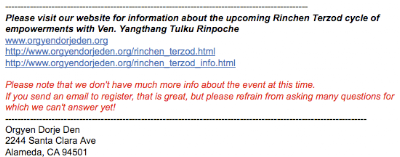 In this latter regard, Orgyen Dorje Den has announced the complete Rinchen Terzod cycle of empowerments for October, to be bestowed by Yangthang Tulku Rinpoche, somewhere in the neighborhood of Alameda, California. I will miss this, as I will be in Asia, but I feel for those who plan on attending. Here is the latest from Orgyen Dorje Den: