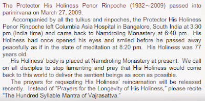 Gyang Khang Tulku (the heart-son of His Holiness Penor Rinpoche), has published immediate advice to all disciples of His Holiness on his website, as noted above. Sunday, March 29, 2009